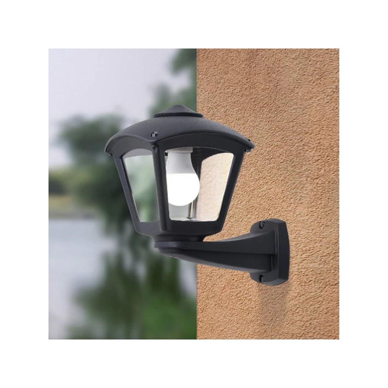 Square modern style wall lantern. Lantern and wall bracket made from shockproof resin material, UV rays stabilized, rust and corrosion-free. E27 lamp holder provided. Insulation class II, protection rating IP55.