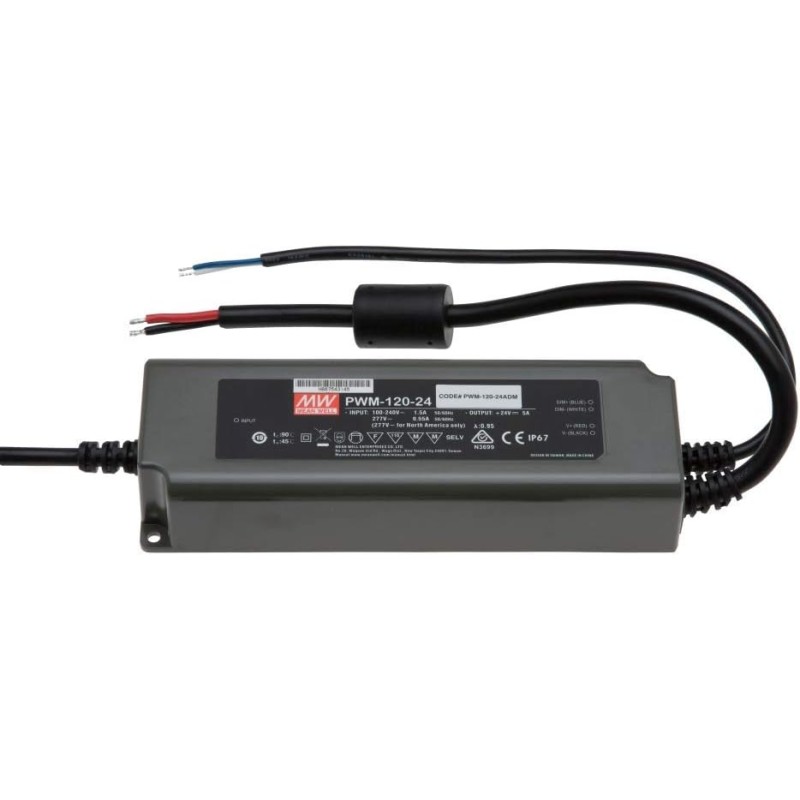 The Mean Well PWM-120 Series is a range of 120W LED Drivers with a built-in 3 in 1 dimming function and transmitting PWM style output, adapting to all kinds of LED strips and ensuring that color temperature and brightness is maintained consistent. The PWM-120 LED drivers have a high efficiency of up to 90.5% and a low no load power consumption below 0. 5W. These LED power supplies are waterproof, with the case made of 94V-0 flame retardant plastic. The interior of the PWM-120 is fully potted in silicone, making these LED drivers suited to meet the anti-vibration demand up to 5G and enhancing the heat dissipation. The PWM-120 LED drivers are IP67 rated and can be used in highly dusty and humid harsh environment. The class II design and the double insulation weather resistant cable makes the PWM-120 Led drivers ideal for flexible installation in applications like LED strip lighting, indoor LED lighting, LED decorative lighting and LED architecture lighting.